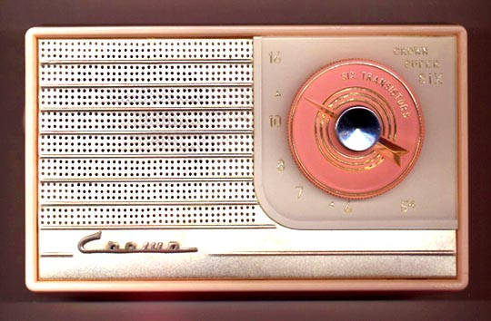 This "Super Six" radio appeared in at least six different cabinet colors: gray, blue, turquoise, black, white, and pink.