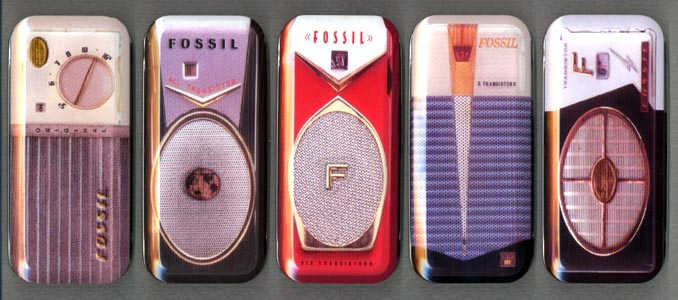 The M31 gallery of reverse plastic:Five Fossil Watch tins in a transistor radio vein...![]() In the mid-to-late '90s, Fossil Watch Company came out with a whole slew of watches that were housed in a whole slew of aluminum watch cases -- dozens and dozens, including at least five which had Fossil-modified images of vintage transistor radios.