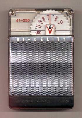 aka Imperial 6T-330 and Jupiter 6T-330, a very sweet and slim little six-transistor shirtpocket with a clear plastic tuning dial housing and two touches of underpainted plastic.