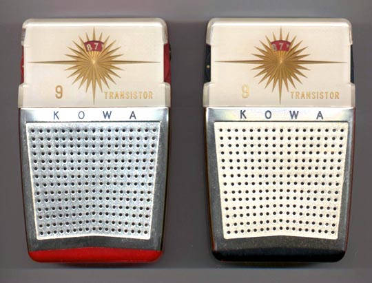 Circa 1961, these 9 Transistor Kowa radios share a cabinet and chassis similar to other 9 Transistor models such as the Harpers GK-900 and Lafayette's FS-91: their speaker grill and reverse-painted plastic designs were pretty much the only variations on the overall layout.