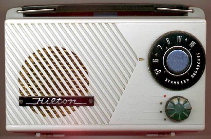 The M31 gallery of... Japan tube portablesHilton GW-3672![]() Mini-tube 4-tube radio, 6" x 3 3/4" x 1 3/4", pale gray thermosetting plastic cabinet with dark green trim, selector knob obviously isn't original. aka "Little Pal" L - 400