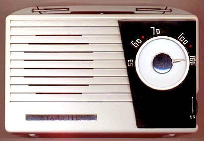The M31 gallery of... Japan tube portablesc.1957 Star-Lite RN-7![]() 4-tube "mini-tube" radio, 5 3/4" x 4" x 1 3/4", pale gray thermosetting plastic cabinet with black/silver/red reverse-painted plastic tuning dial area. The "STAR LITE" badge is not original.