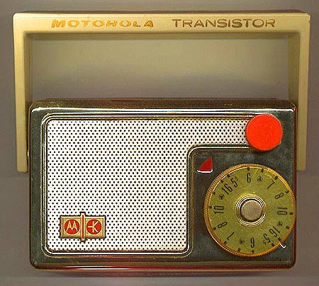 Motorola's solution was much more in-your-face in appearance than was GE's -- nearly bordering on the ridiculous -- and also much more memorable... The antenna was housed inside a plastic "carrying handle" many times bulkier than a simple brass wire handle such as what the Zenith Royal 500 or Emerson 888 employed. In terms of actual fat content, Motorola's "Weatherama" handle, pictured on these pages, wins the prize hands-down: The cubic volume of the handle alone exceeds the entire cabinet volume of many of the smaller Japanese pocket transistor radios.