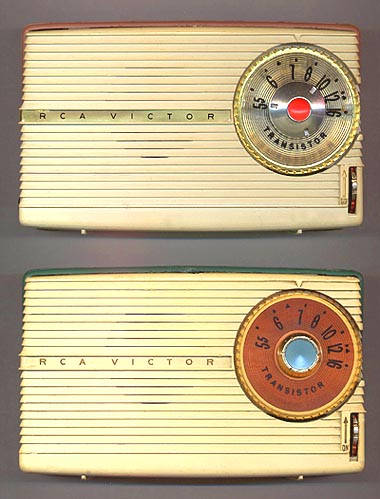 And speaking of primitive but in a more functional vein, note that neither face reveals just how many transistors are employed within: each simply states, "transistor." That's because both were merely 4-transistor radios -- pretty lame for 1956.