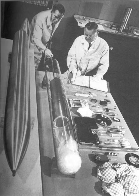Loading the capsule: Note how the transistor radio lies on the table right next to the bikini and the Beatles 45...