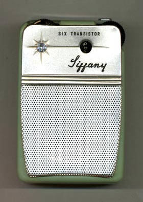 aka "Polly," a teeny-tiny radio in a very pretty celadon green cabinet, with a rhinestone set into the starburst pattern on the dial plate.