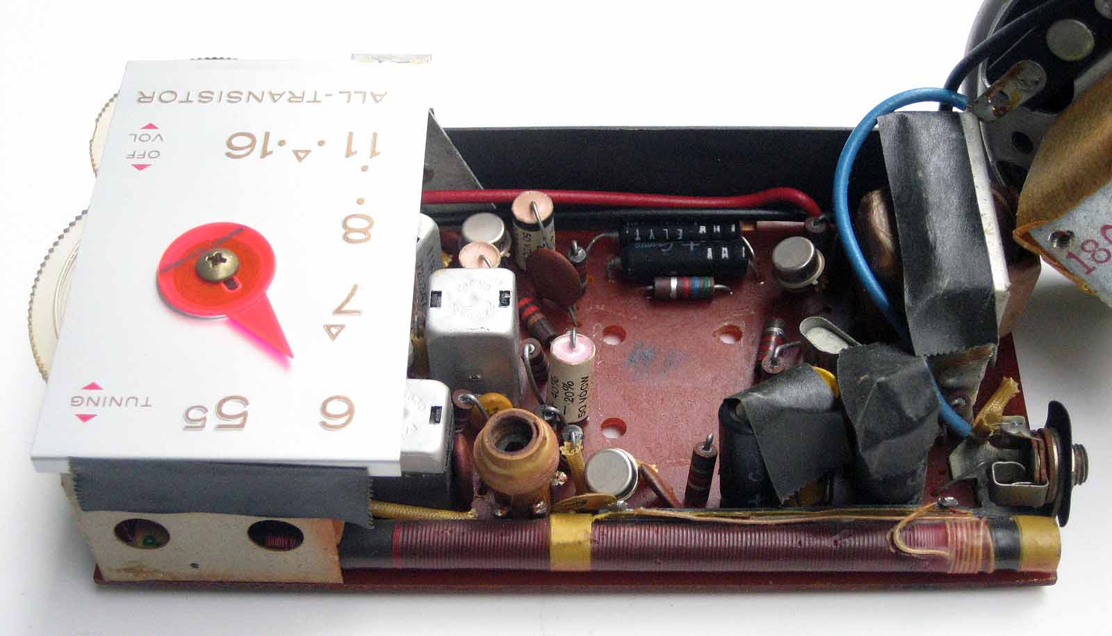 The 555 employed a mere four transistors in its circuitry, and so, like most other 4-transistor sets of the time, it called itself an "All Transistor" radio. (Apparently several later versions had 5- and 6-transistor circuits.) Here, the E046, E048 and E049 are top hats, and the E050 is an oval transistor with an aluminum shield wrapped around it.