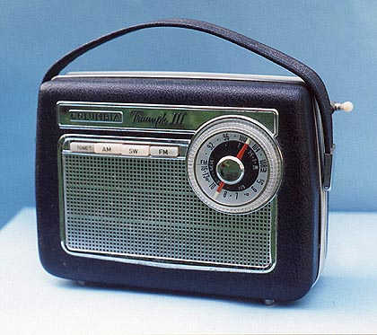 Circa 1961, a 3-band AM/FM/SW 9-transistor portable made by Nordmende. Hinged telescopic antenna pulls out from the side. Leatherette cabinet measures 9 x 6 1/2 x 3 1/4