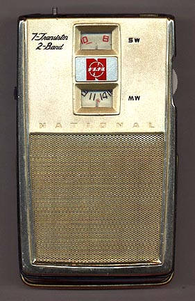 An early '60s SW shirtpocket radio, the SW band covering 4-10 MHz. This set used a 6-VOLT battery which was a little shorter and a little fatter than 1.5V AA cell -- a very unusual battery for a pocket transistor radio, SW or not... Cabinet dimensions measure 2 1/2 x 4 1/4 x 1 1/4