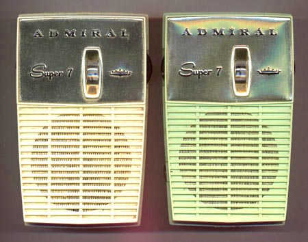 You would never know it from this scan, but the Admiral Super Seven is a very handsome radio. And I think at least one set I tried had very good reception and audio quality for a shirtpocket radio. Besides the white and green cabinets shown above, the Super Seven also came in gray, black, coral, and beige.