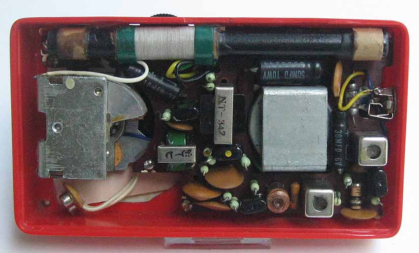 A very nice usage of cabinet plastics — the whitish plastic on the front dial area has a unique pearlescent finish (though unfortunately whatever plastic this was had a susceptibility to heat deformation, as has been seen on a number of examples found under various distributor names) — and the bright red plastic cabinet itself is made of hard, glossy thermosetting plastic, something often found on Japanese transistor radios made before 1959.
